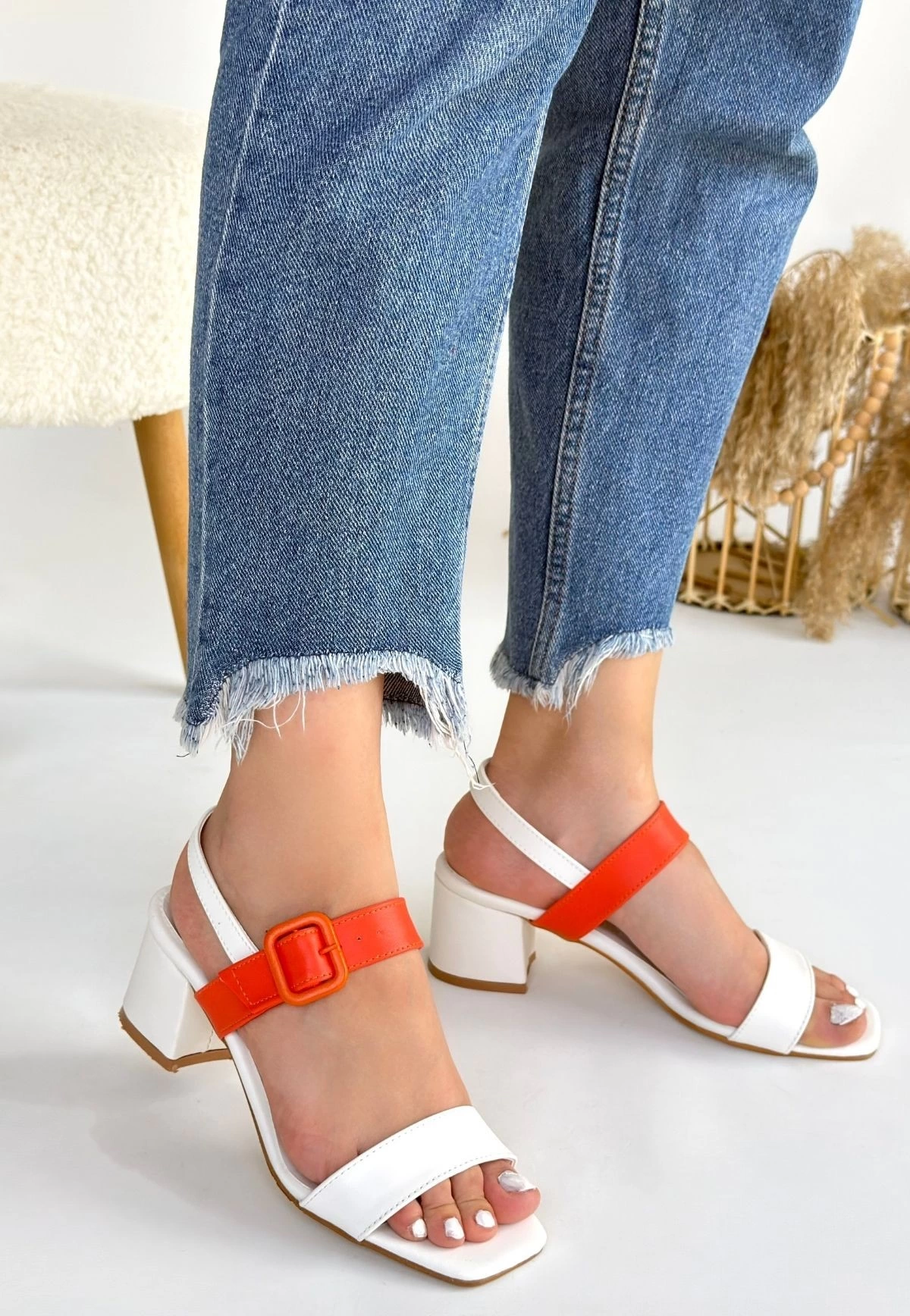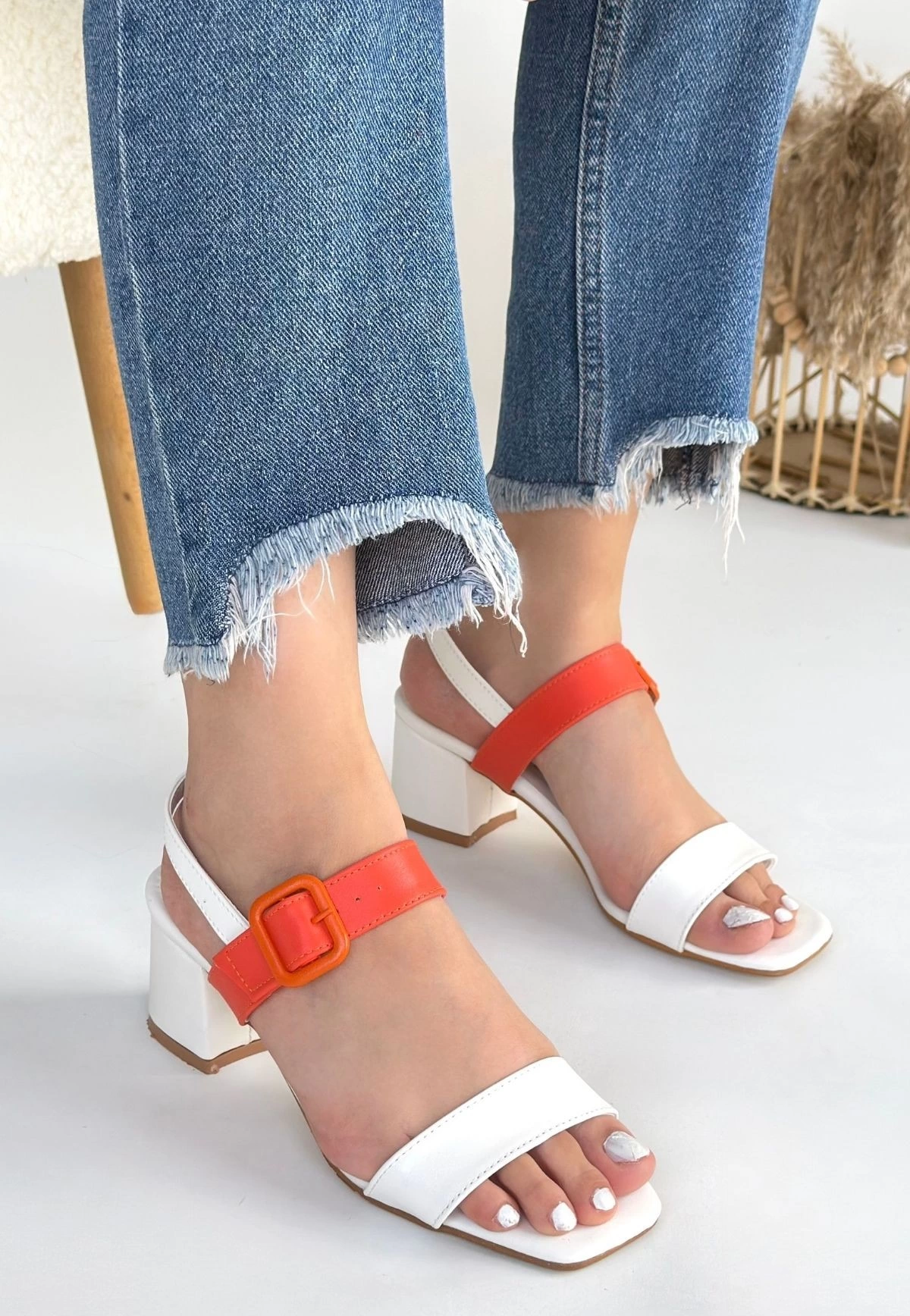 Year Beyaz Cilt Turuncu Detaylı Beyaz Topuklu Ayakkabı