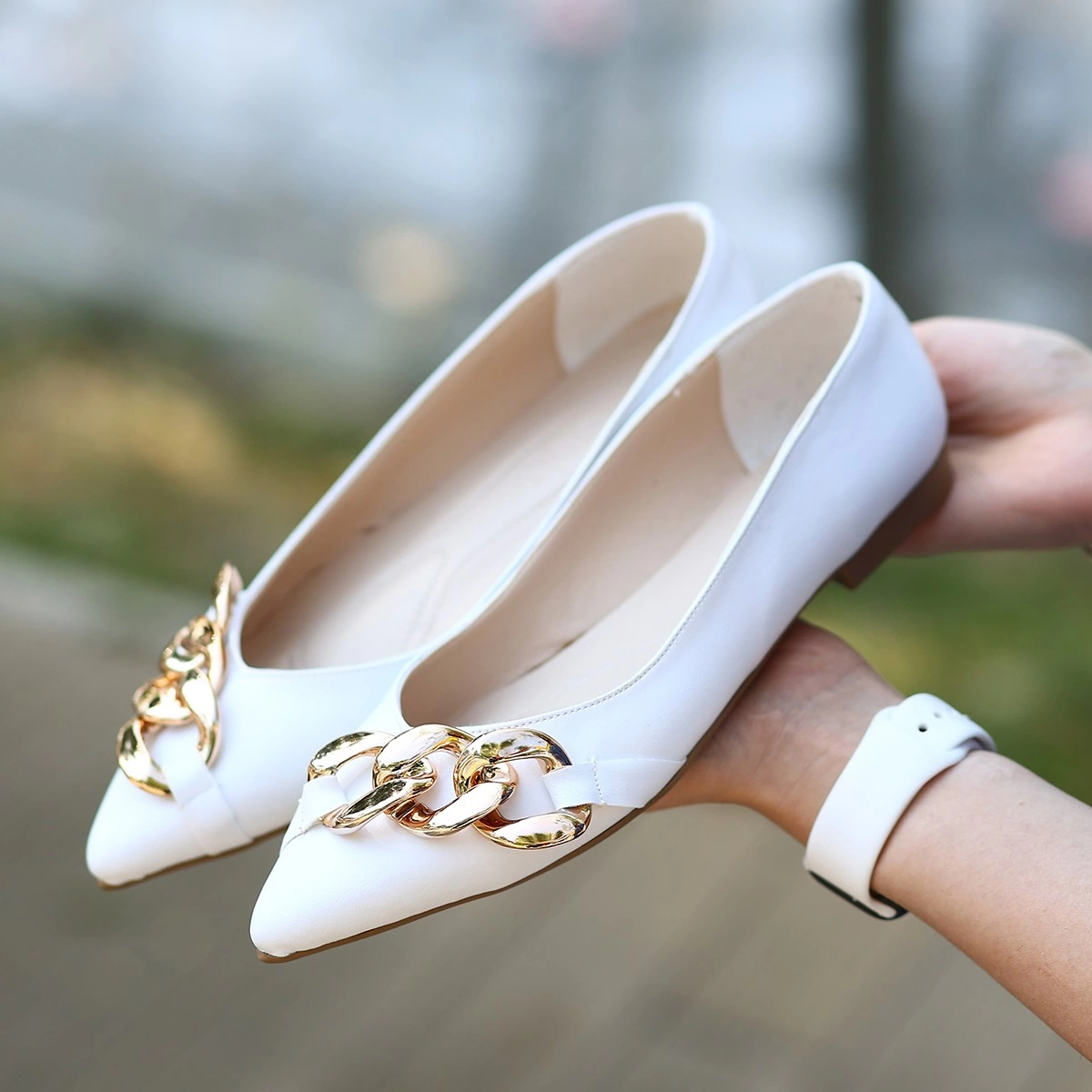 Popi Beyaz Cilt Zincirli Babet Ayakkabı