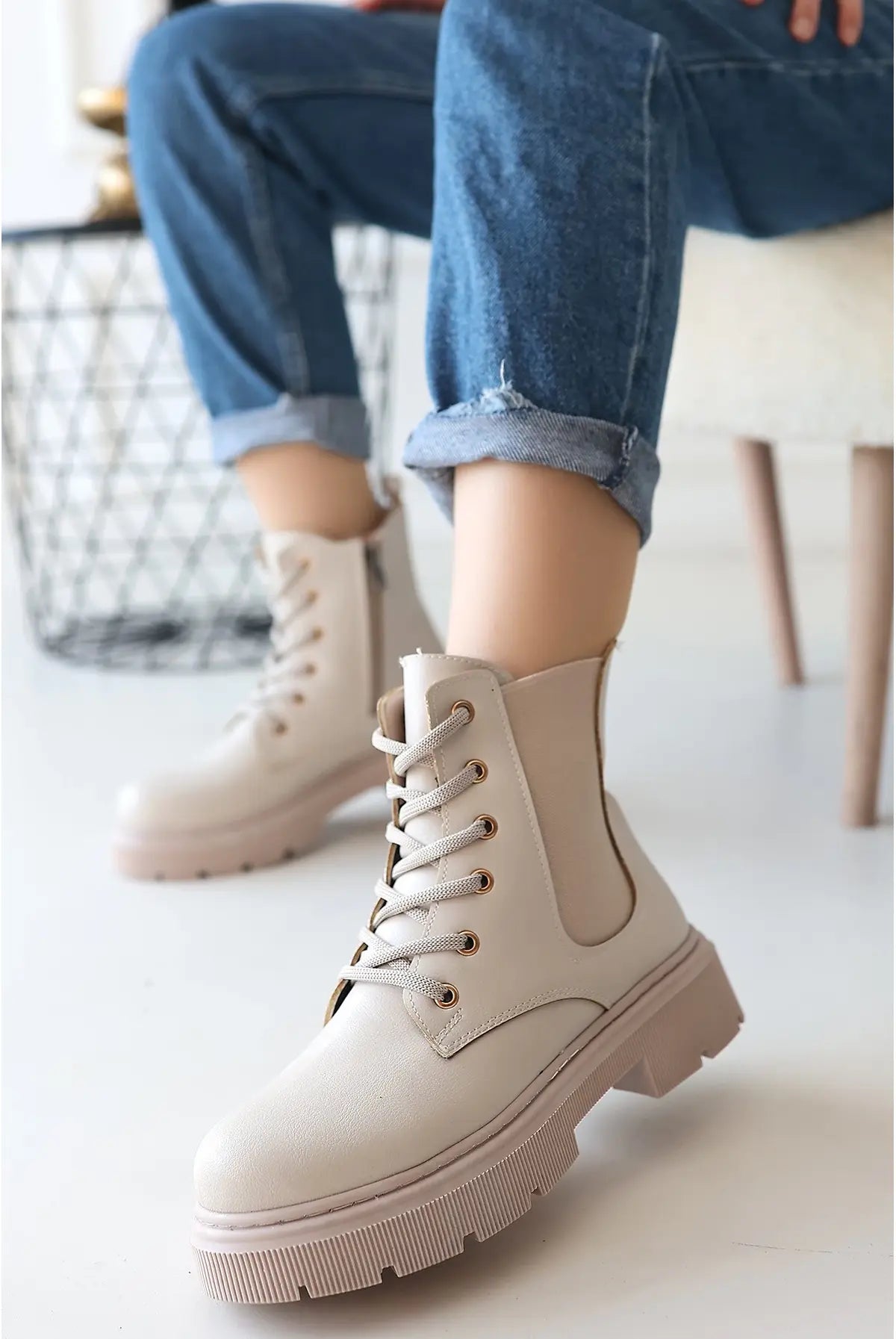Detay : Topuklu Yandan Fermuarlı Lastikli Bağcıklı Bot