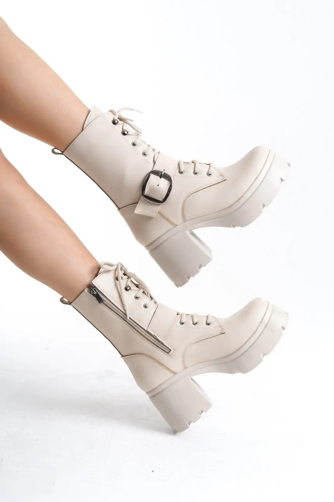 Linma Bej Cilt Bağcıklı Topuklu Bot