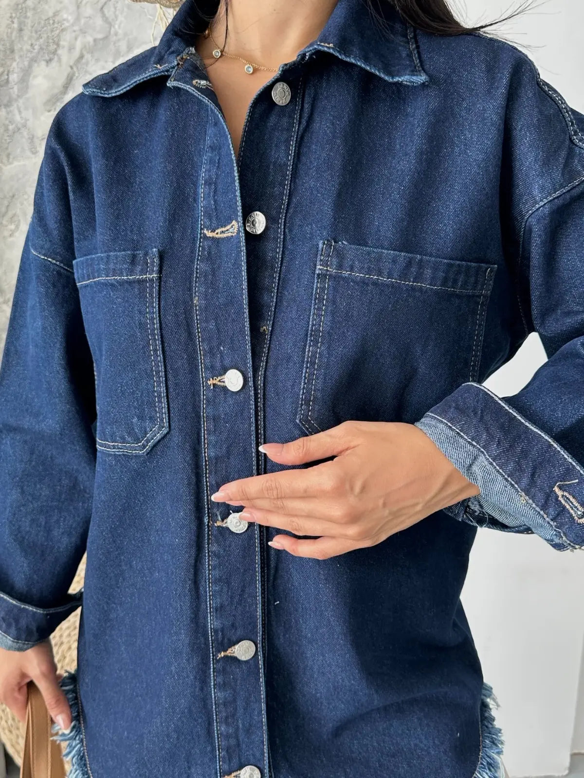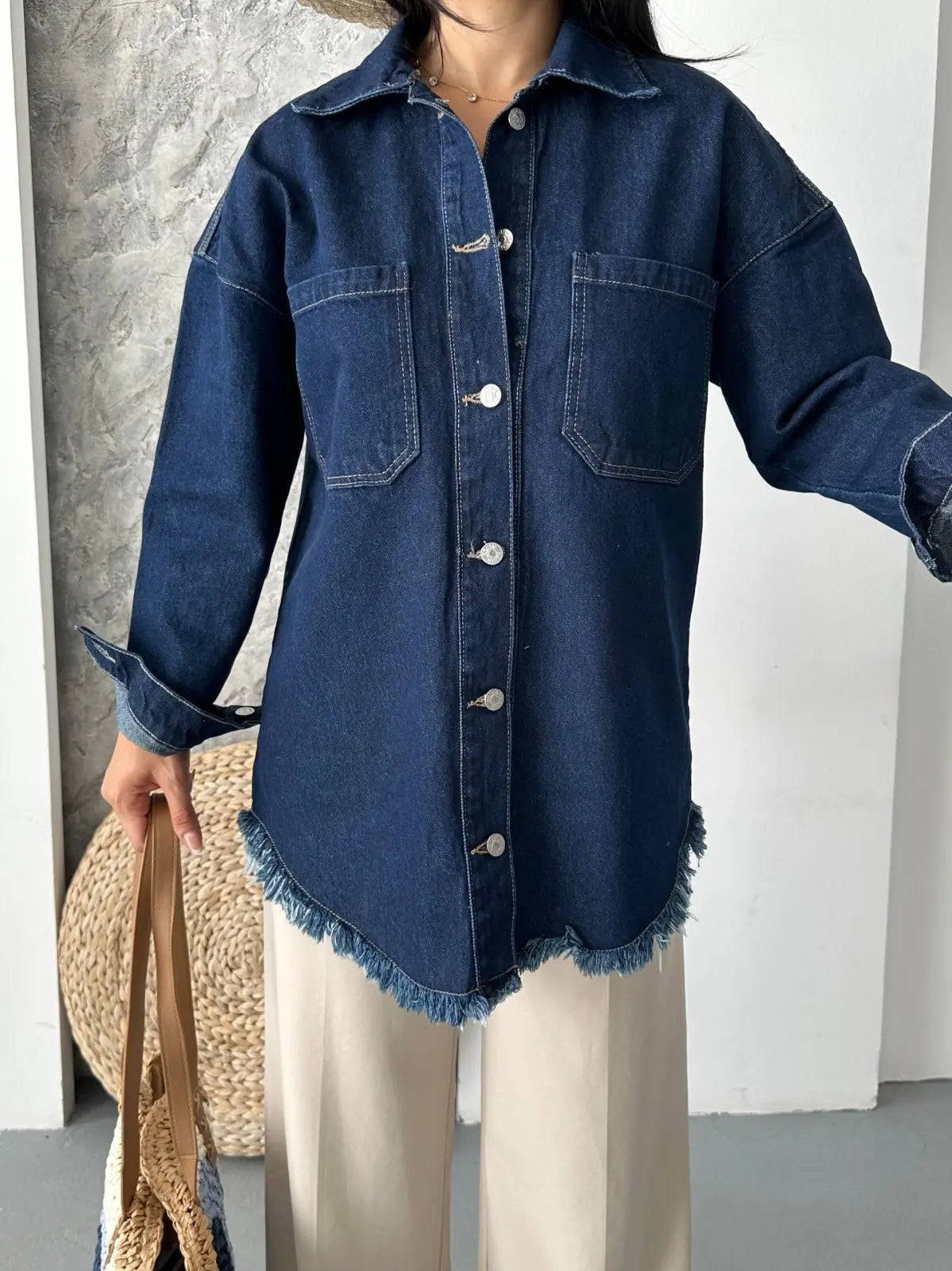 Cepli püsküllü kar yıkama kot ceket koyu mavi D2515, şıklığı ve rahatlığı bir arada sunar. Hem günlük hayatta hem de özel günlerde tercih edebileceğiniz bu ceket, gardırobunuzun vazgeçilmezi olmaya aday.