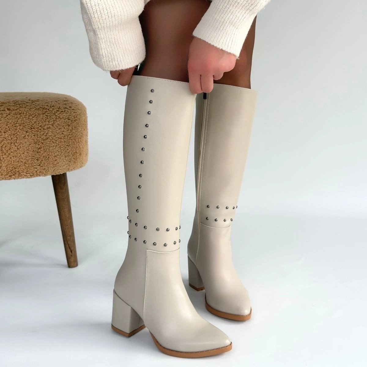 Tiyan Bej Cilt Topuklu Çizme