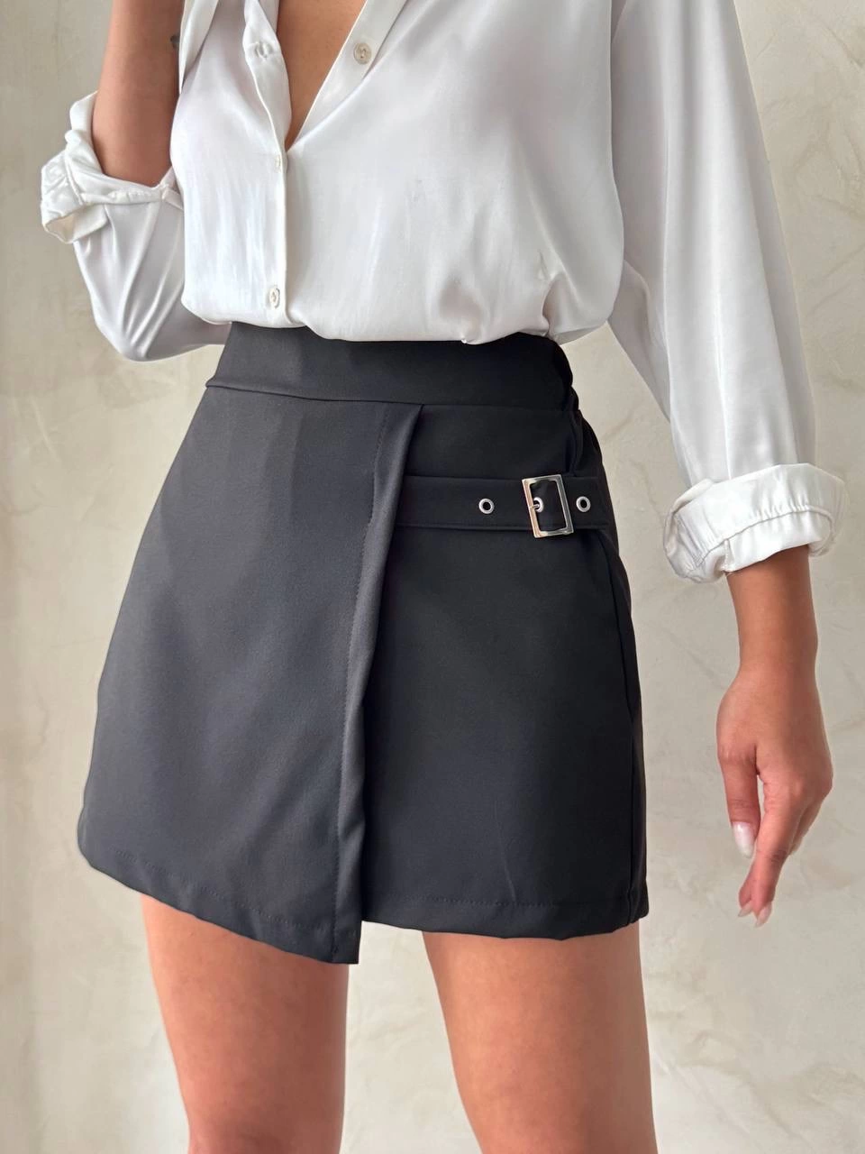 Kadın tokalı siyah şort etek, şıklık ve rahatlığı bir arada sunar. Markasız ürün, kaliteli kumaşı ve şık tasarımıyla öne çıkar.