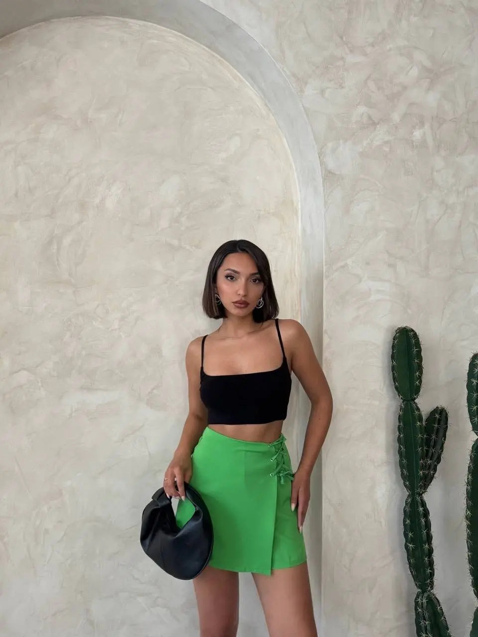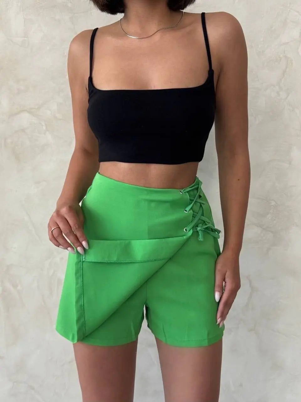 Şık yeşil rengi, yaz aylarında sizi ferah ve stil sahibi gösterecek. Yazın vazgeçilmezi olan şort etek, her kombinle rahatlıkla uyum sağlar.