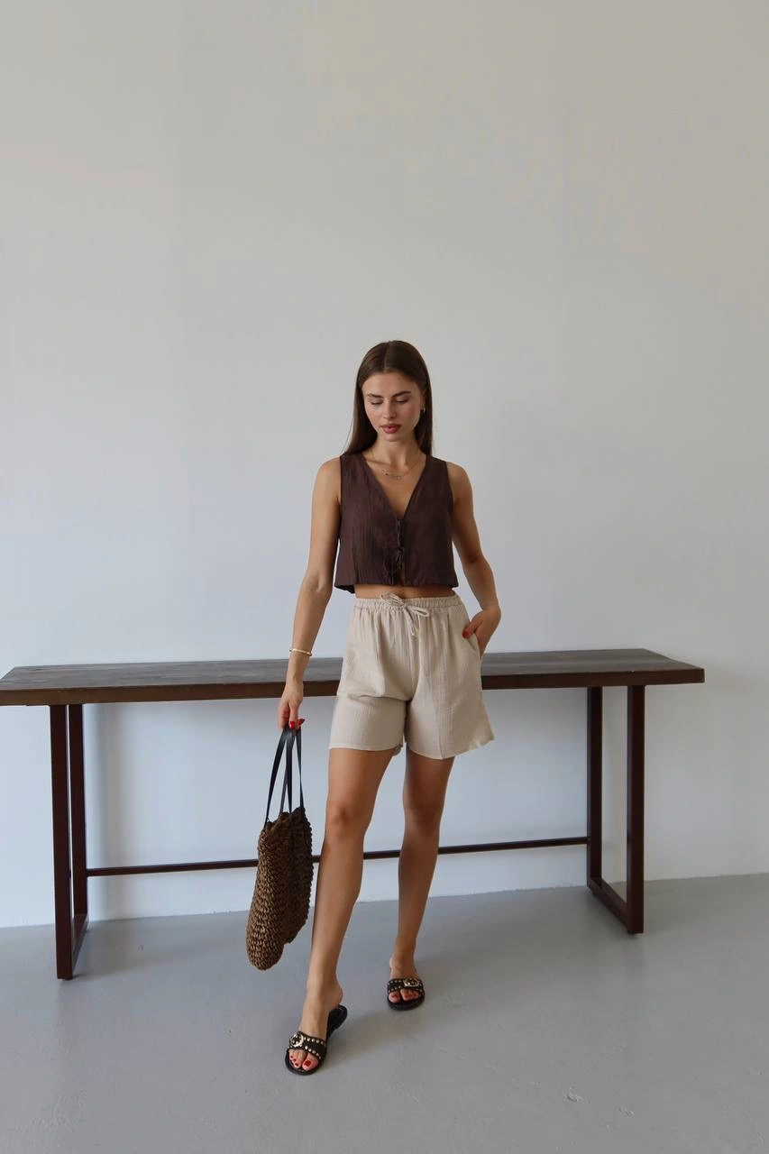 Bu bağcıklı bej şort, hem şık hem de rahat bir seçenektir. Müslin kumaştan üretilmiş olan bu şort, yaz aylarında vazgeçilmeziniz olmaya aday. İster günlük kombinlerinizde ister plajda şık bir alternatif arıyorsanız, bu şort tam size göre!