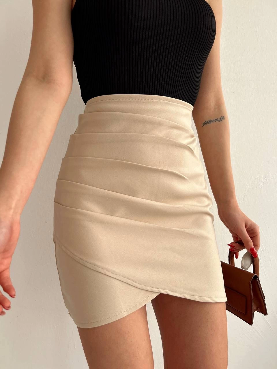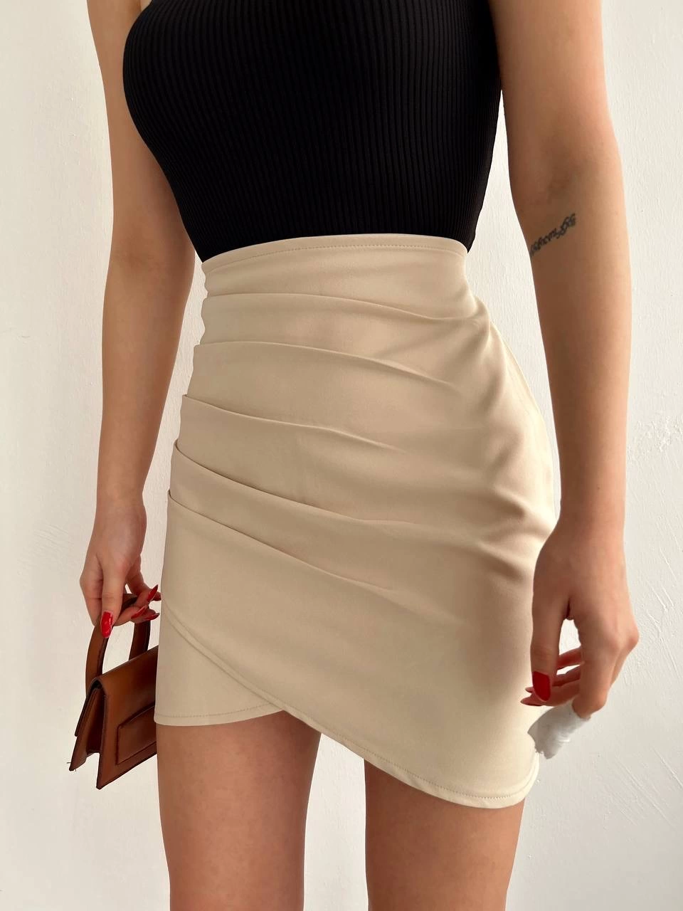 Yandan drapeli asimetrik etek bej s24771, gardırobunuza şıklık katacak bir parça.