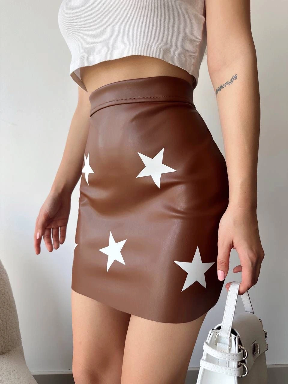 Bu şık ve trend yıldız baskılı deri etek, gardırobunuza yıldızı bir parça ekleyecek! Modern ve şık tasarımıyla her kombini mükemmel bir şekilde tamamlayacak.