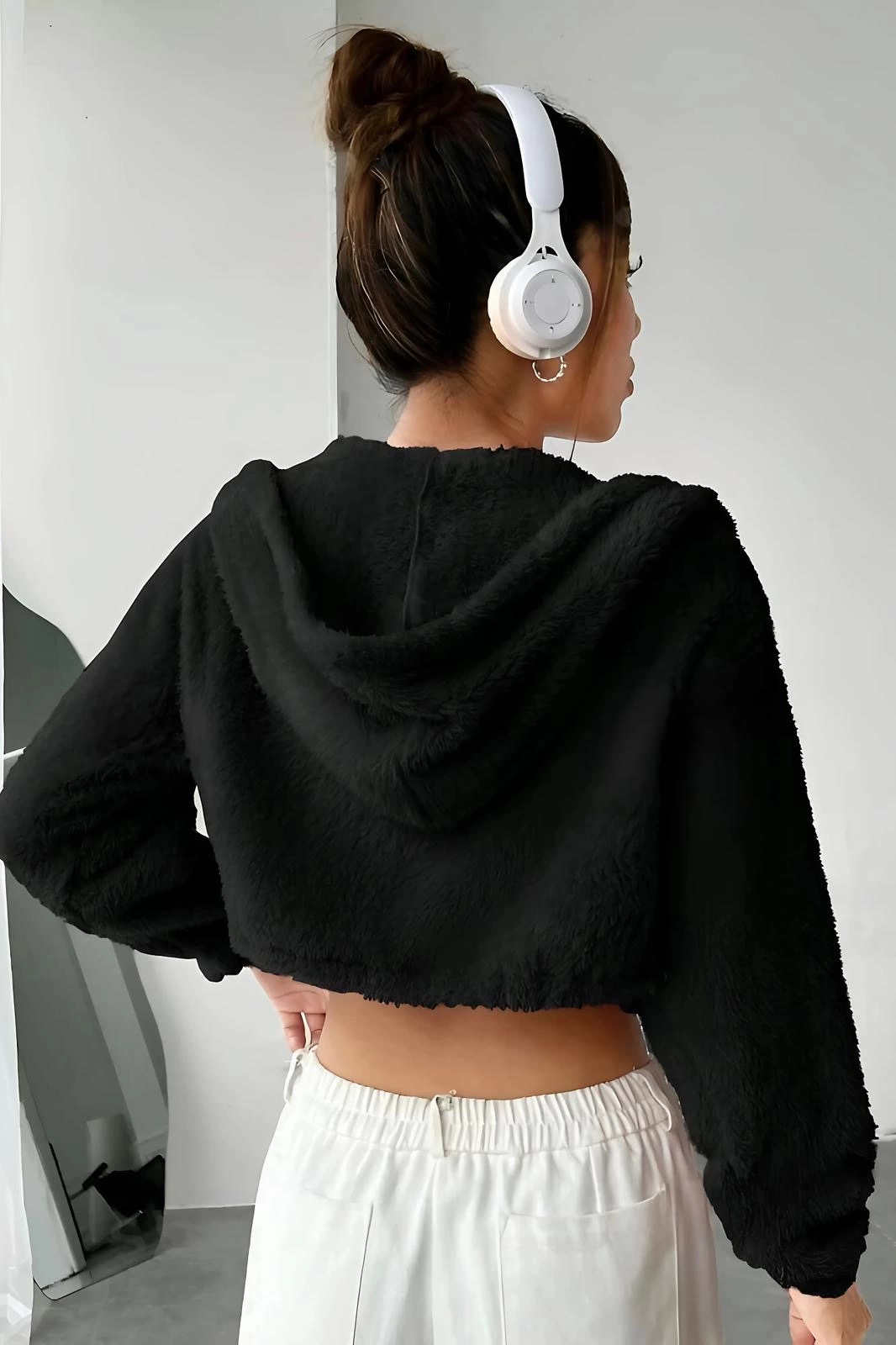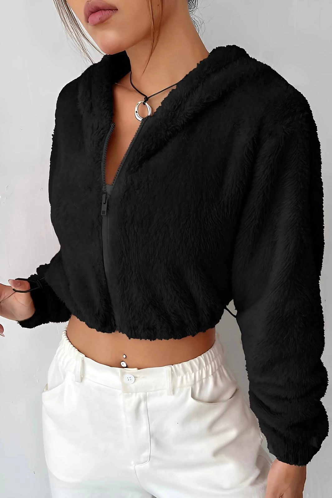 Şık ve rahat bir görünüm için dolabınızda mutlaka bulunması gereken Kapşonlu Siyah Peluş Ceket, soğuk havalarda sizi sıcacık tutacak bir seçenektir.