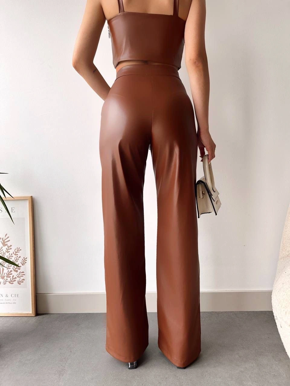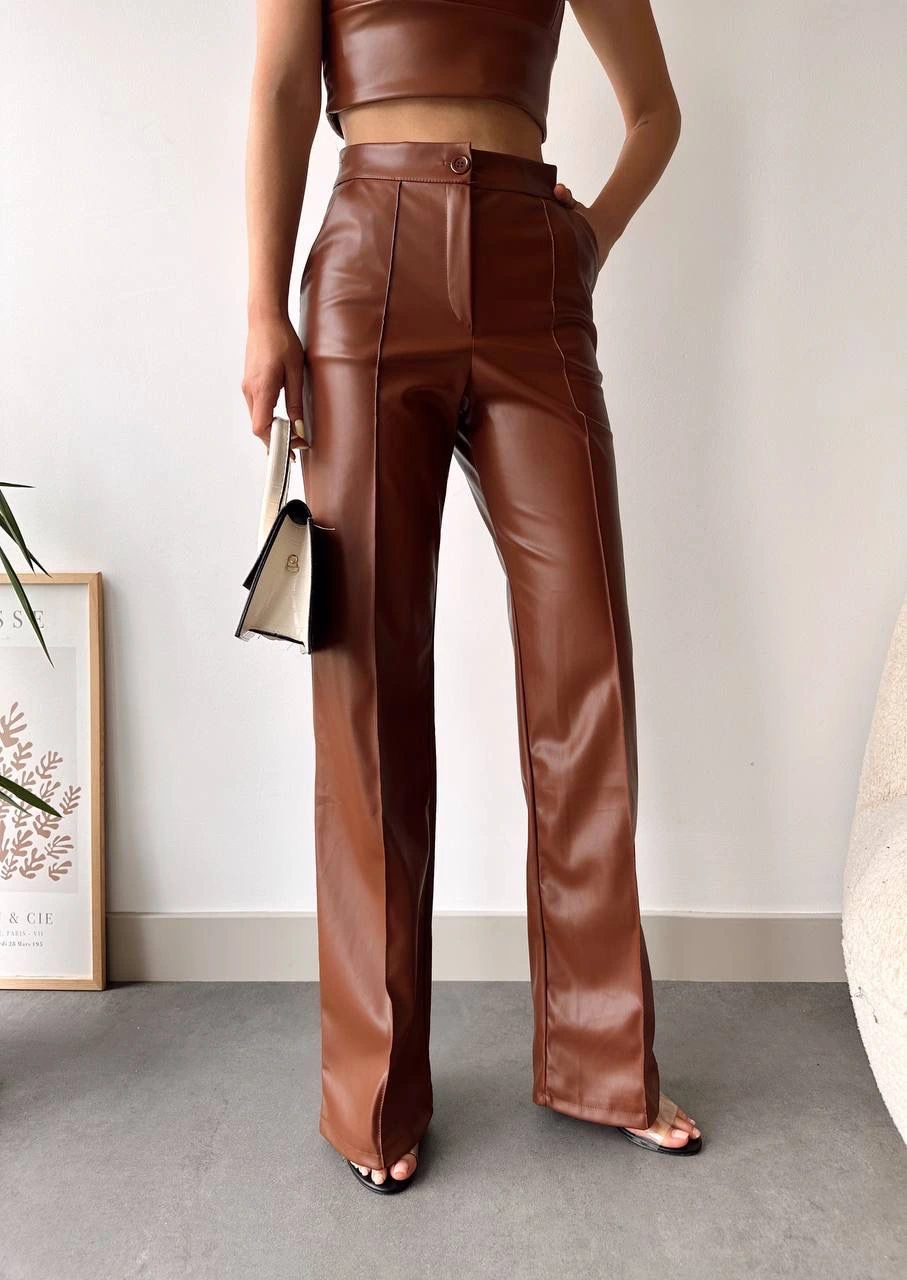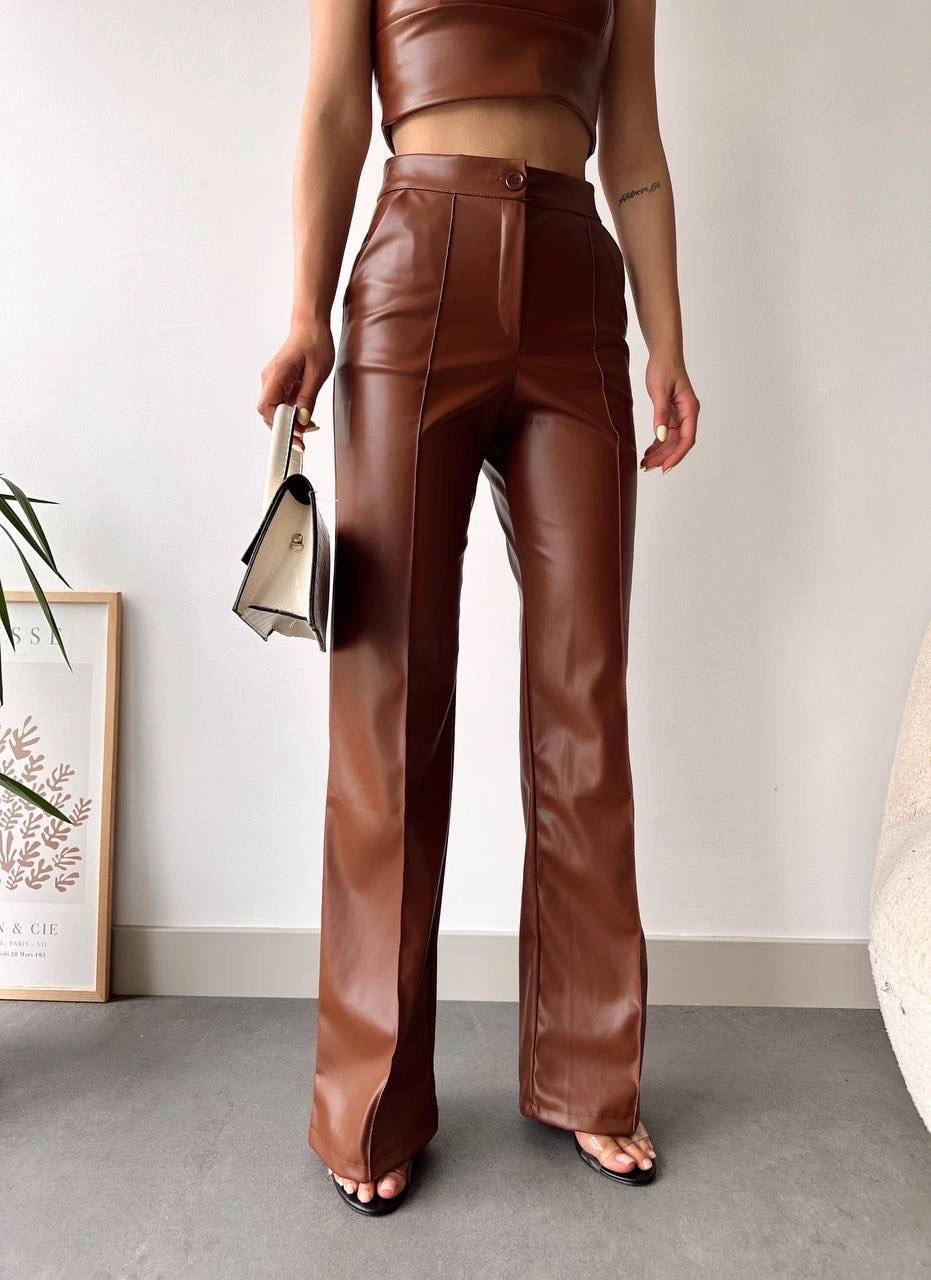 Yüksek bel tasarımı ve geniş paçası ile şıklığı ve rahatlığı bir arada sunan Deri Palazzo Pantolon, gardırobunuzun vazgeçilmezi olmaya aday! Kahve rengi ile hem klasik hem de modern kombinlerde şık bir seçenek sunar.