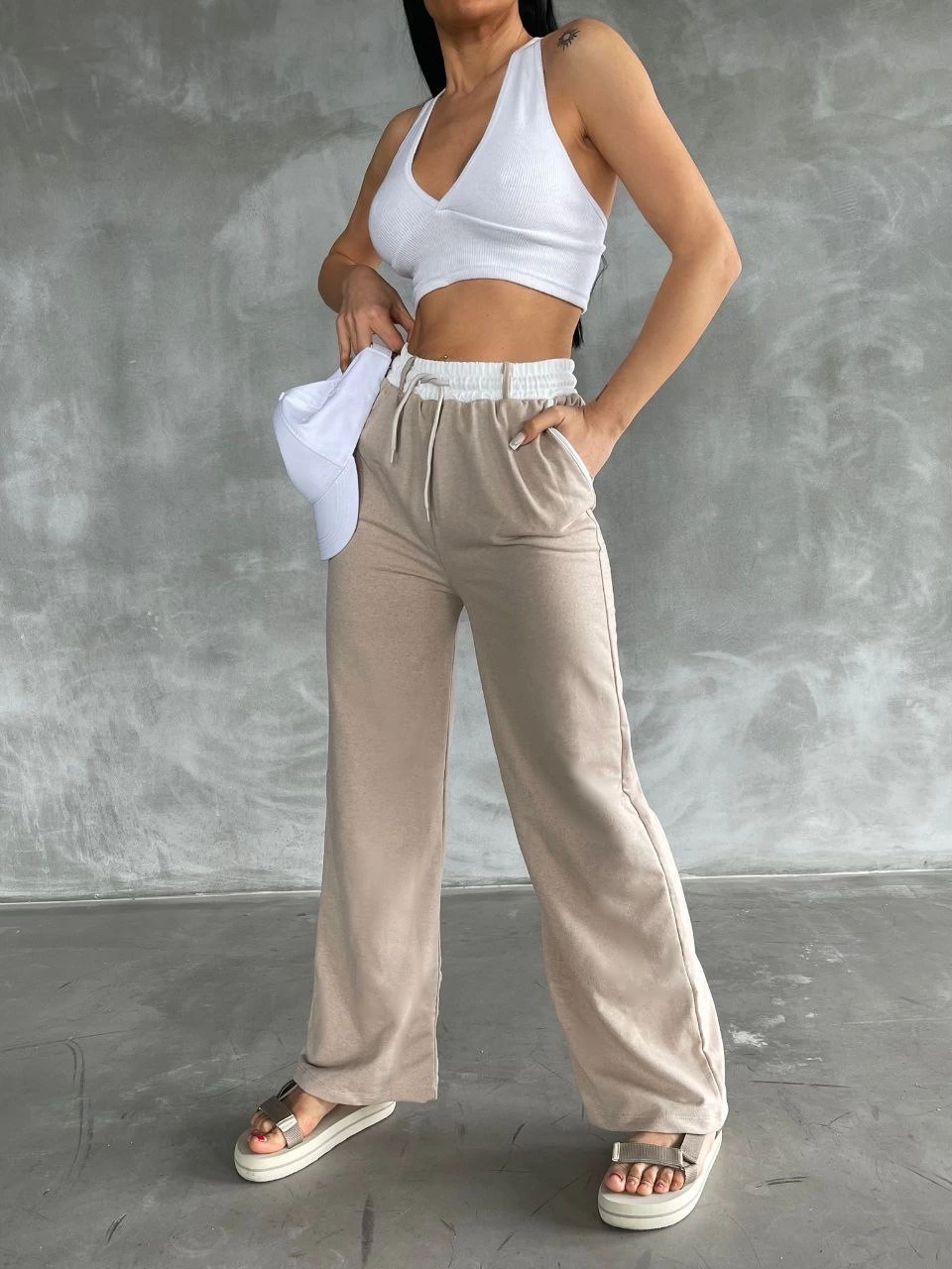 İnce ve zarif garni dokusu pantolonun şıklığını arttırırken, geniş paça tasarımı hareket özgürlüğü sağlar.