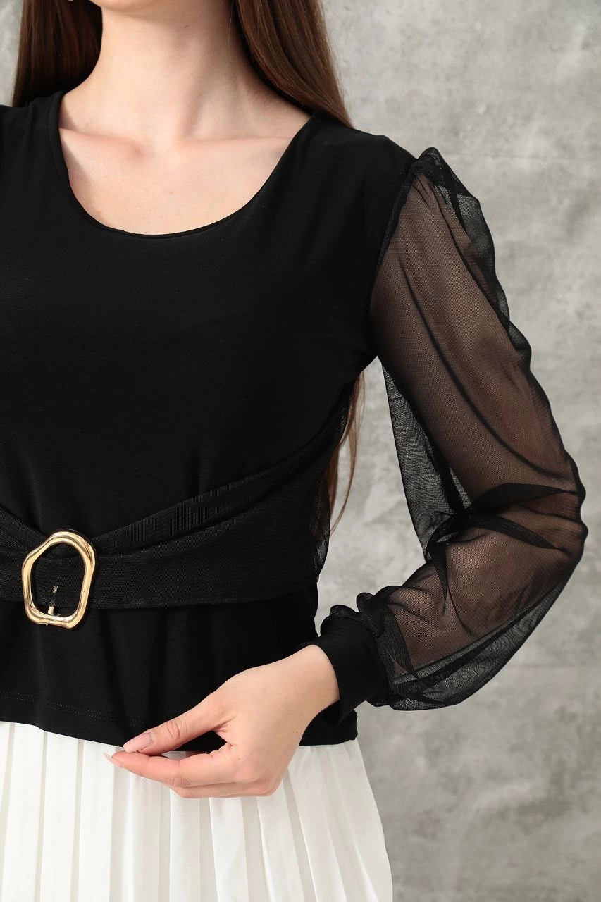 Şıklık ve zarafetin buluştuğu Tokalı Tül Kollu Bluz Siyah T4071, gardırobunuzun vazgeçilmez parçalarından biri olmaya aday!